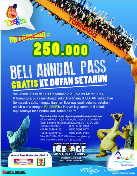 Ternyata bener!! Dunia Fantasi (DUFAN) lagi melakukan promosi besar-besaran. Terhitung mulai 1 December 2013 – 31 Maret 2014 cukup dengan membayarkan 250.000 rupiah, kita bisa memiliki Annual Pass Dufan yaitu kartu keanggotaan berlangganan selama setahun. Dan dengan kartu ini pula kita bisa menikmati semua wahana di Dufan setiap hari (termasuk Sabtu, Minggu, dan Libur Nasional) sampe puaaassss.