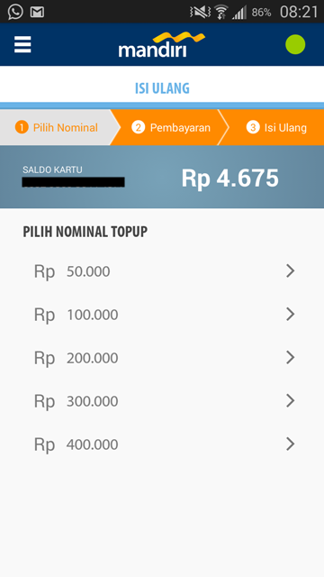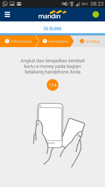 - Setelah terinstall, nyalakan NFC di smartphone dan tempelkan kartu e-money dibelakang smartphone dan diamkan. Akan tampil aplikasi isi ulang dengan informasi saldo dan pilihan nominal topup.