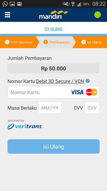 - Setelah memilih nominal, isi nomor kartu debit disertai dengan masa berlaku dan kode CVV (kode 3 digit terakhir di belakang kartu)