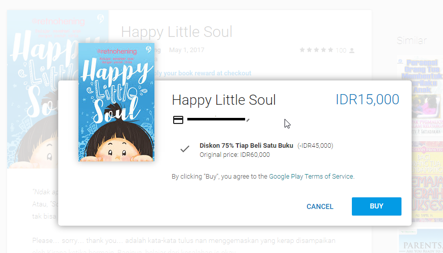Tanpa basa basi langsung saya klik dan penasaran bener ga promonya. Ternyata alhamdulillah bener! Buku Happy Little Soul yang tadinya 60 ribu sekarang belinya jadi cuma 15 ribu. Wah alhamdulillah banget.